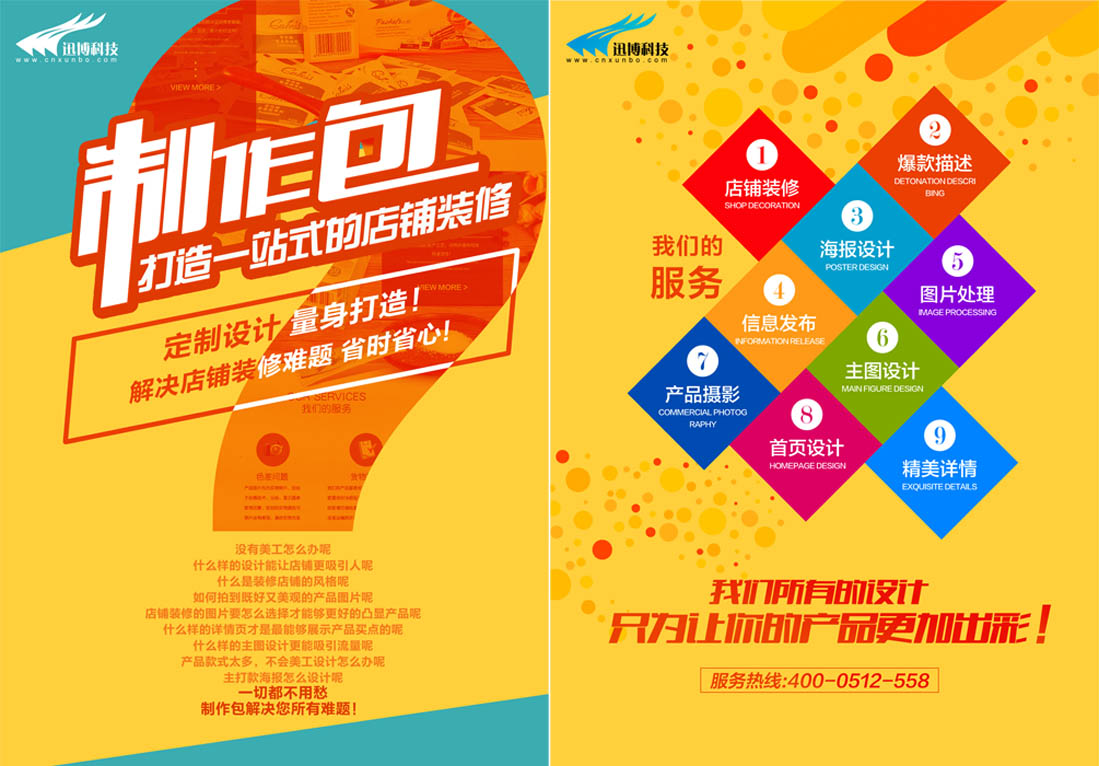 店鋪制作包:對(duì)店鋪的招牌,自定義模塊,分類(lèi)、首頁(yè)以及寶貝詳情頁(yè)面的美化裝飾!結(jié)合產(chǎn)品特點(diǎn)配合整體版面布局以及色彩搭配為企業(yè)打造具有視覺(jué)沖擊力的店鋪,從而吸引買(mǎi)家的停留以及彰顯企業(yè)實(shí)力。